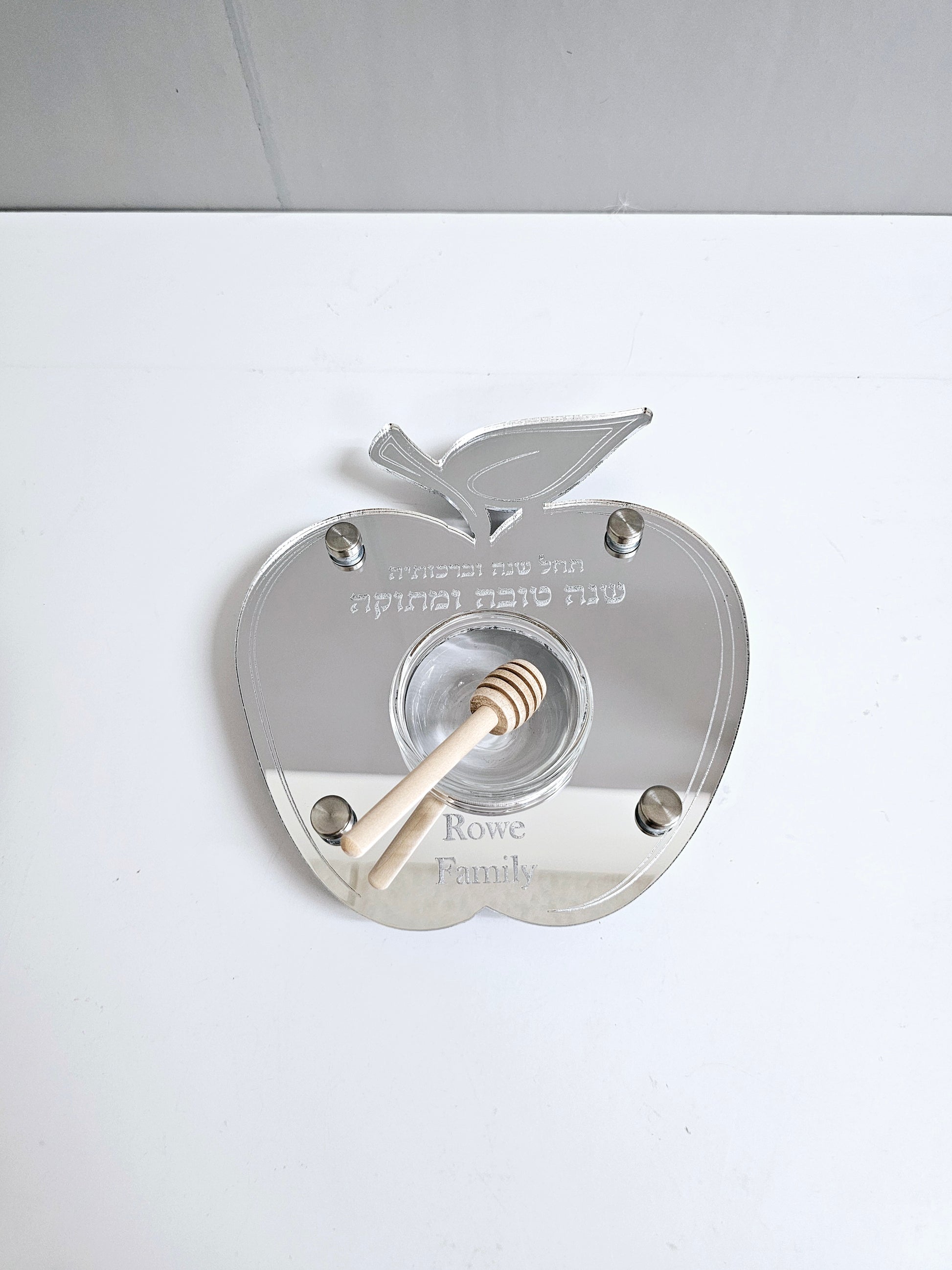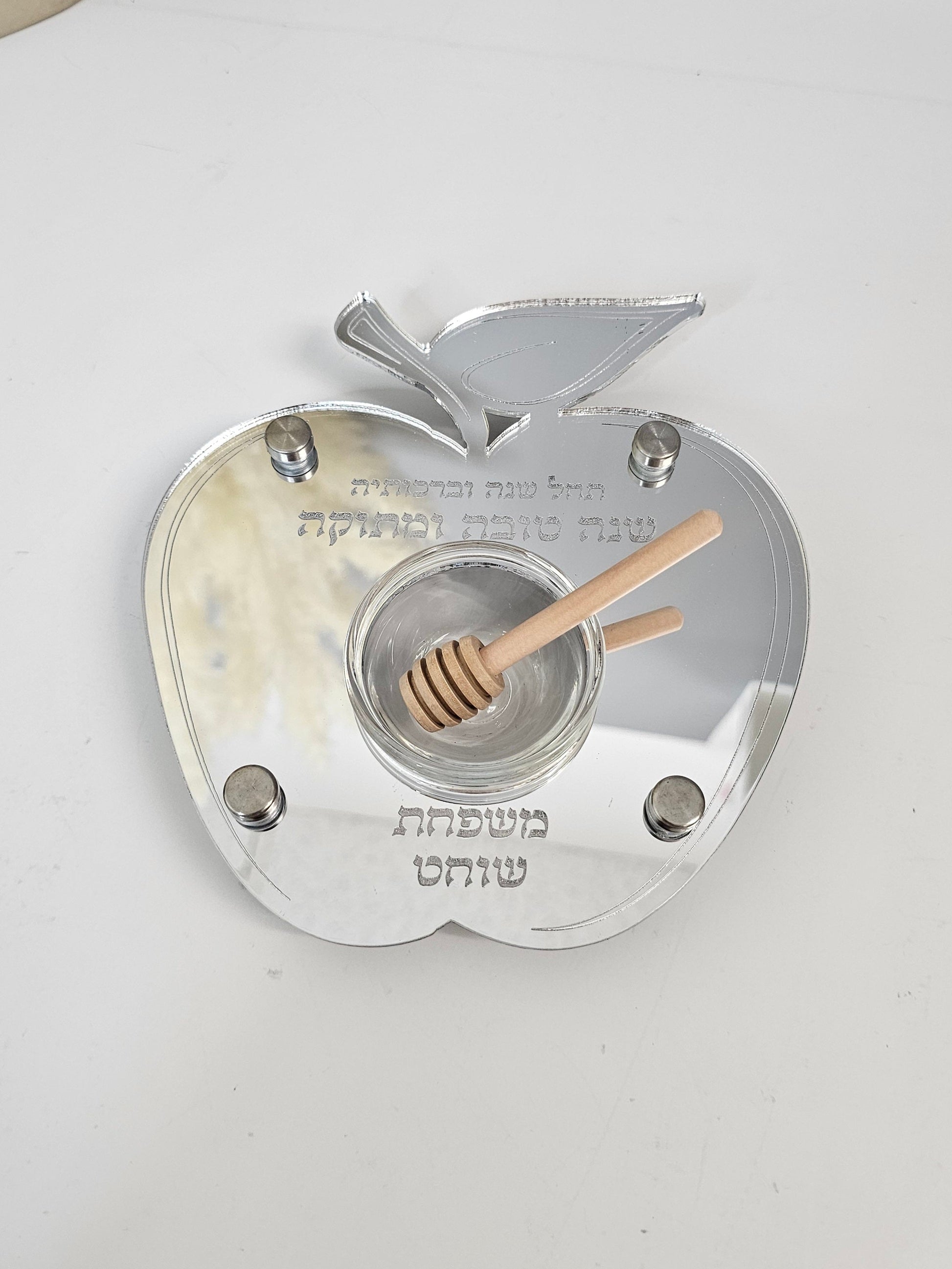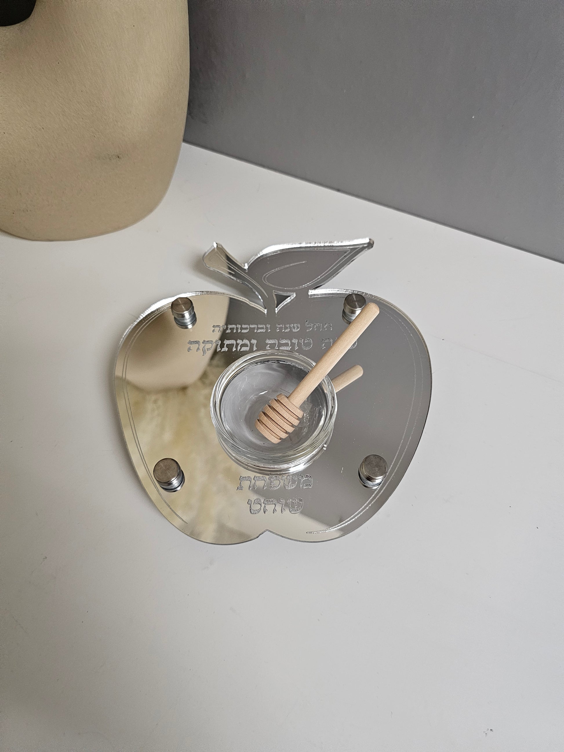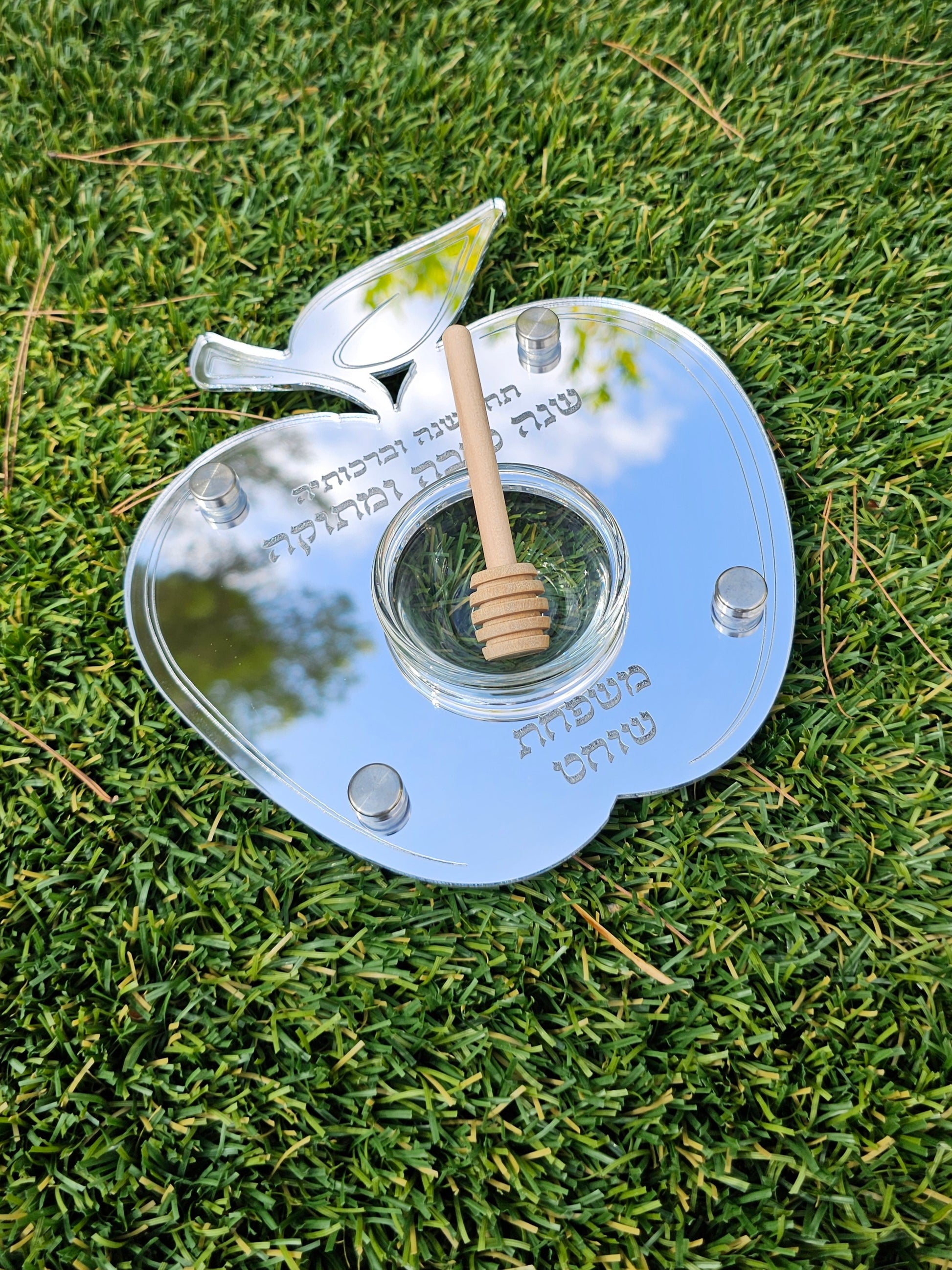 Celebrate Rosh Hashanah with elegance and meaning. This apple-shaped honey dish is crafted from high-quality mirrored acrylic and available in a variety of color options, so you can match it perfectly to your holiday table décor. The reflective finish symbolizes light and sweetness for the new year, while the Hebrew blessing engraved on the surface adds a special, traditional touch.