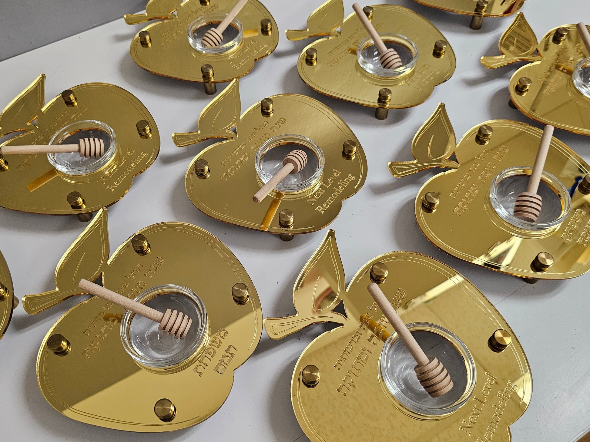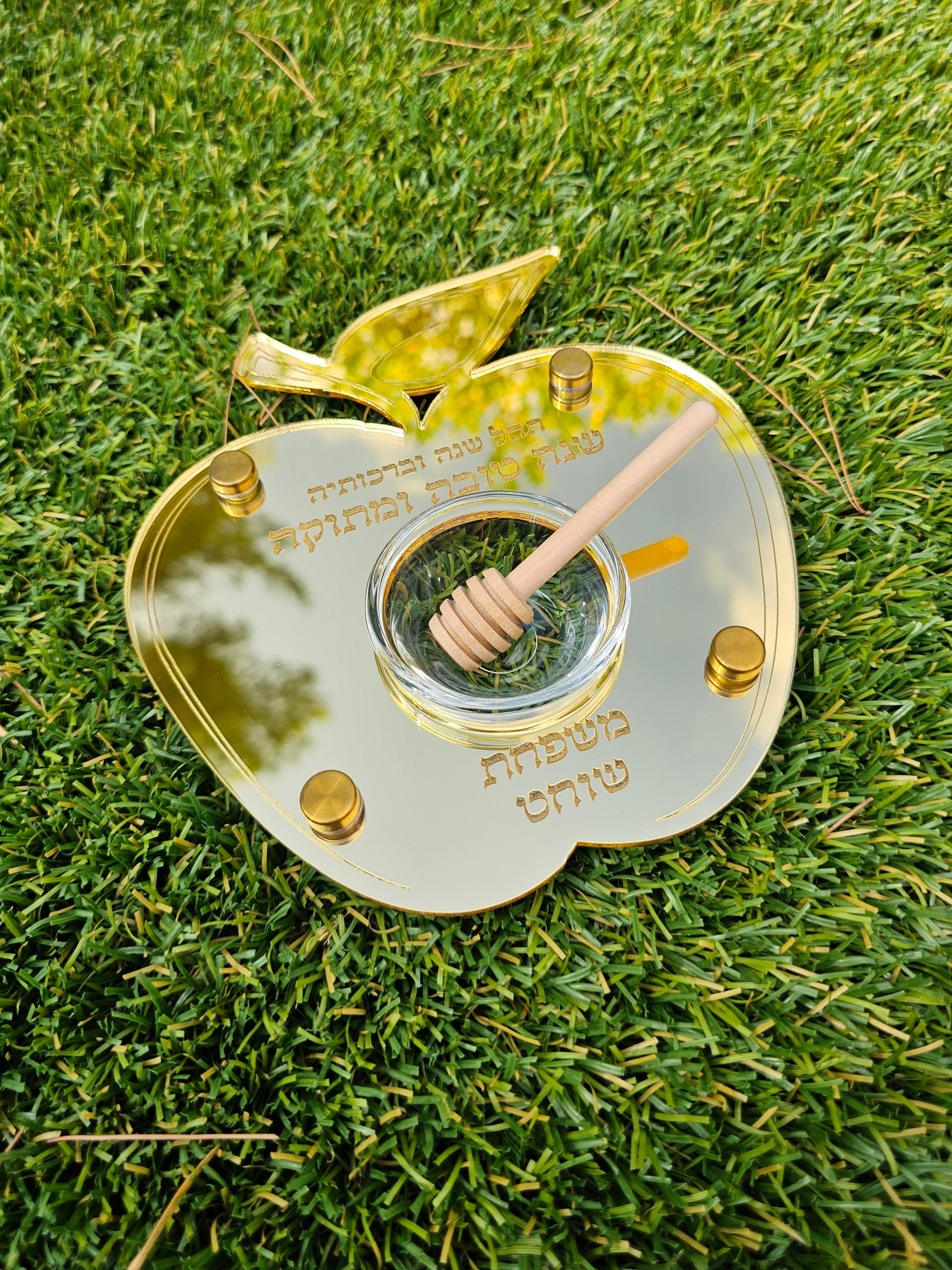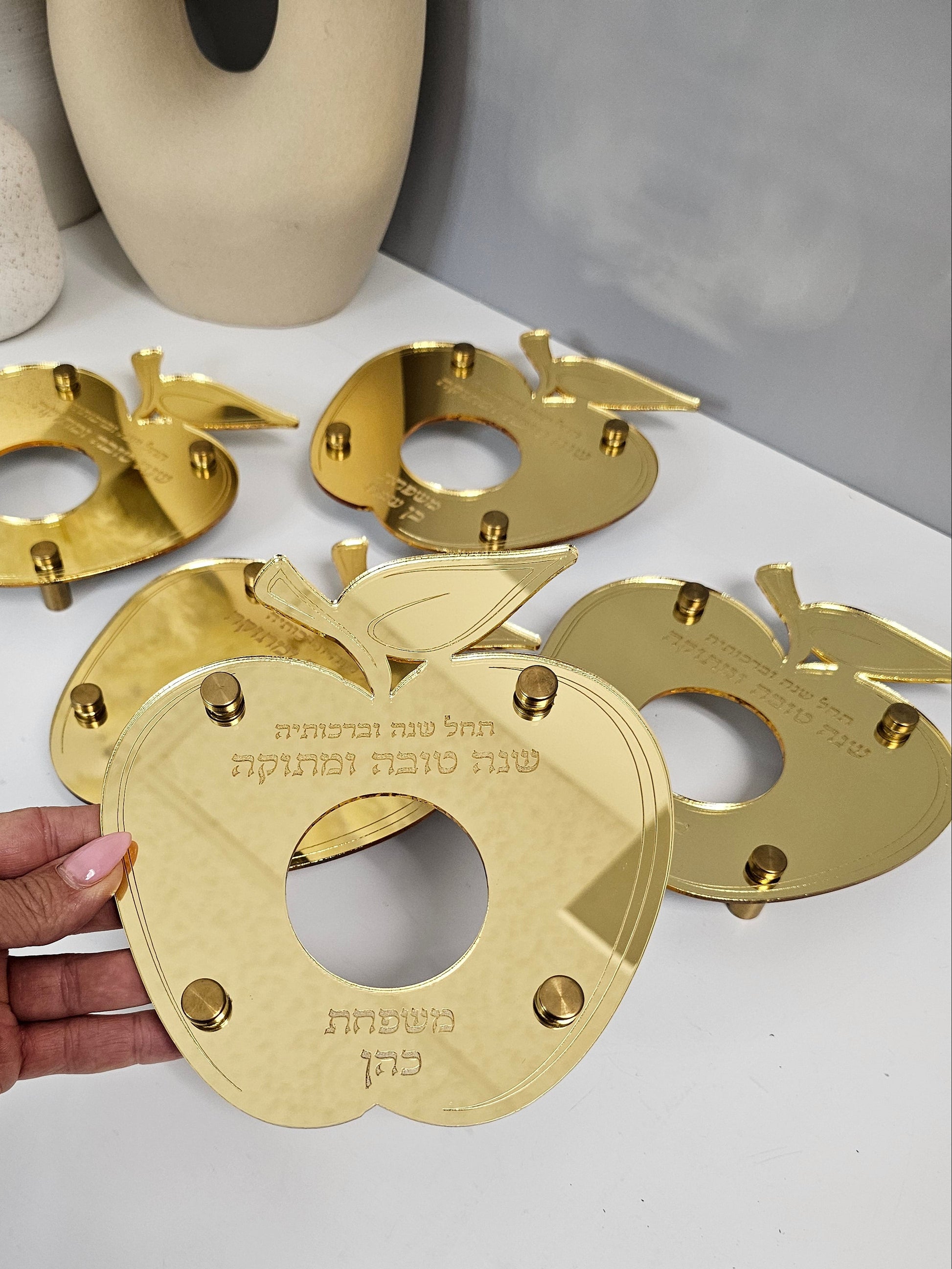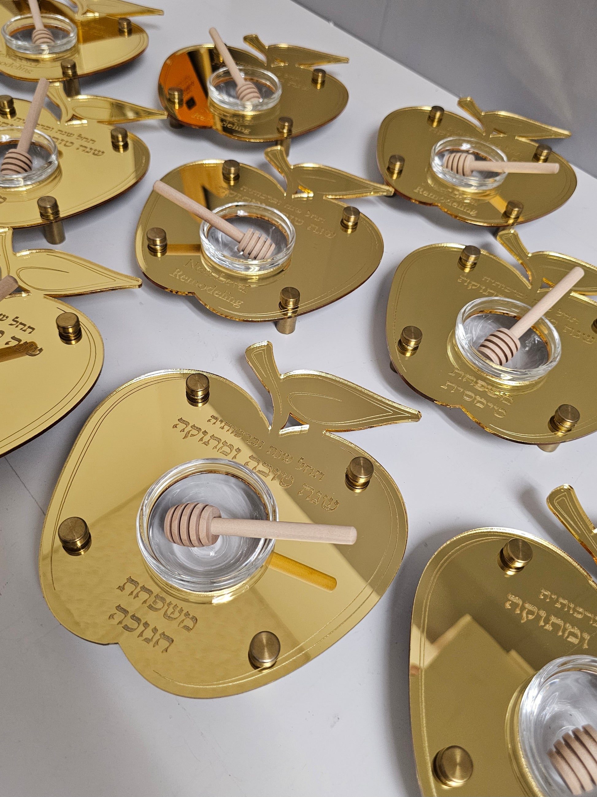 Celebrate Rosh Hashanah with elegance and meaning. This apple-shaped honey dish is crafted from high-quality mirrored acrylic and available in a variety of color options, so you can match it perfectly to your holiday table décor. The reflective finish symbolizes light and sweetness for the new year, while the Hebrew blessing engraved on the surface adds a special, traditional touch.