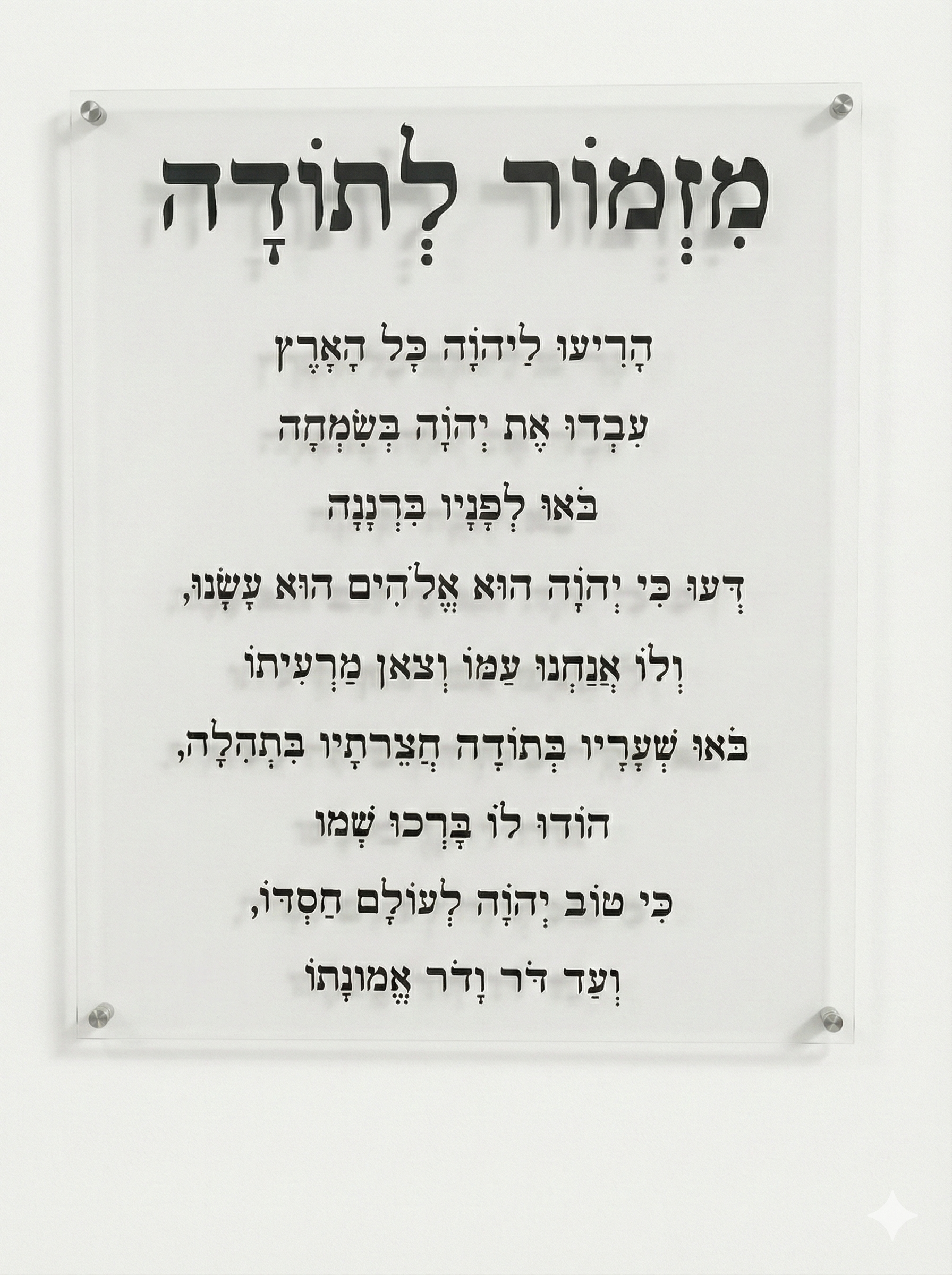 Bring gratitude and protection into your space with this Mizmor Le Toda Acrylic Print, featuring the powerful words of Psalm 100 – a heartfelt song of thanks. Printed in deep black UV ink on crystal-clear acrylic, this minimalist yet meaningful piece radiates calm, strength, and timeless Jewish beauty. Perfect for entryways, living rooms, kitchens, or study spaces, Mizmor LeToda is known to invite blessings, health, and gratitude into the home. This wall art makes a meaningful Jewish gift for a housewarming, wedding, or personal milestone. Details: Black UV print on 1/4" clear acrylic Mounted with stainless steel standoff screws (available in silver, gold, or black) Modern, sleek, and easy to hang Multiple size options available Crafted in Los Angeles, this elegant piece merges tradition and contemporary design, making it a standout in any Jewish home. Custom sizes and personalization available upon request.