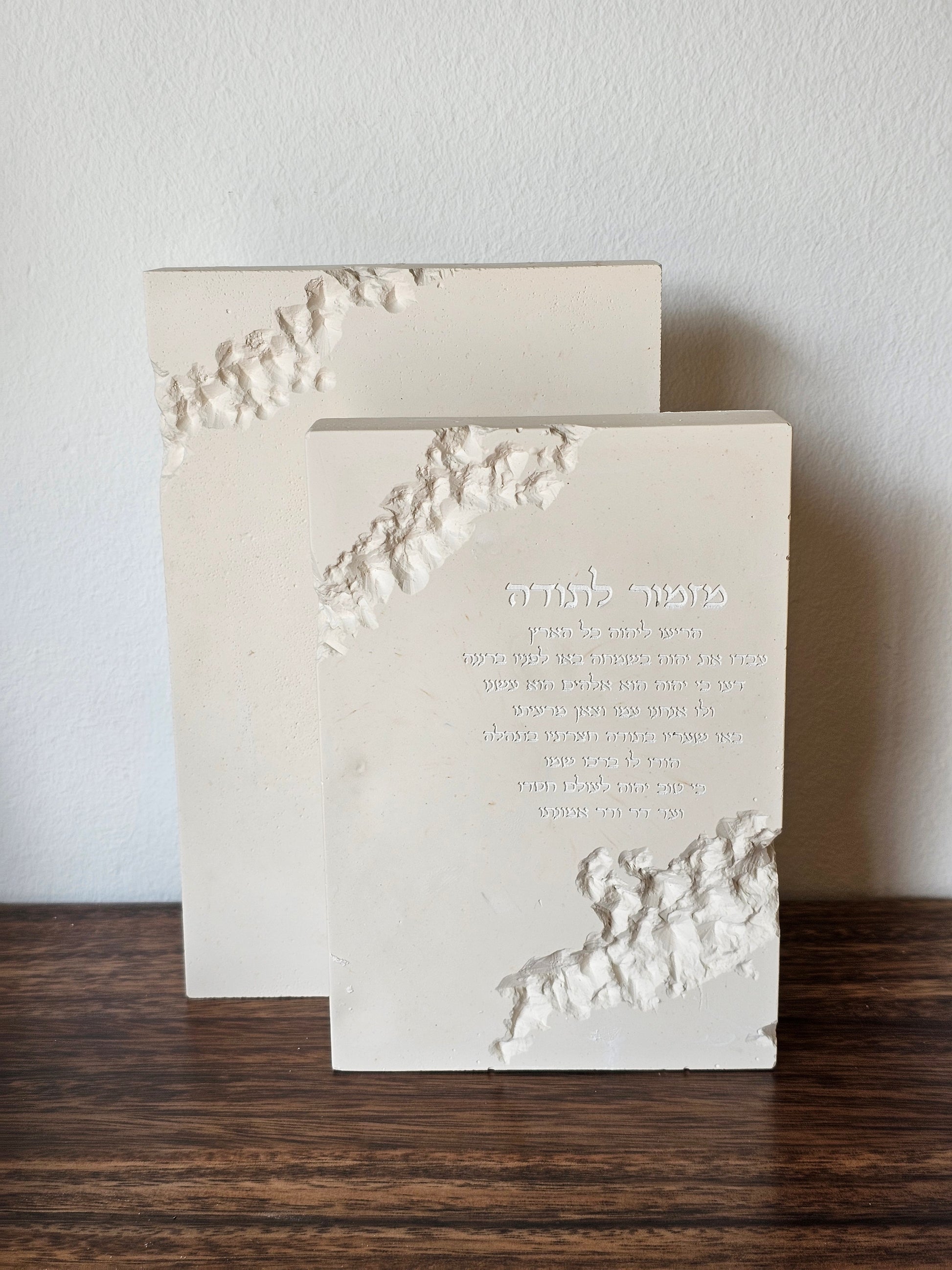 Bring peace, gratitude, and timeless elegance into your home with this handcrafted Mizmor Le Toda (Psalm of Thanks) plaque. Made from a natural stone finish and engraved in Hebrew, this piece is both meaningful and beautifully minimal.