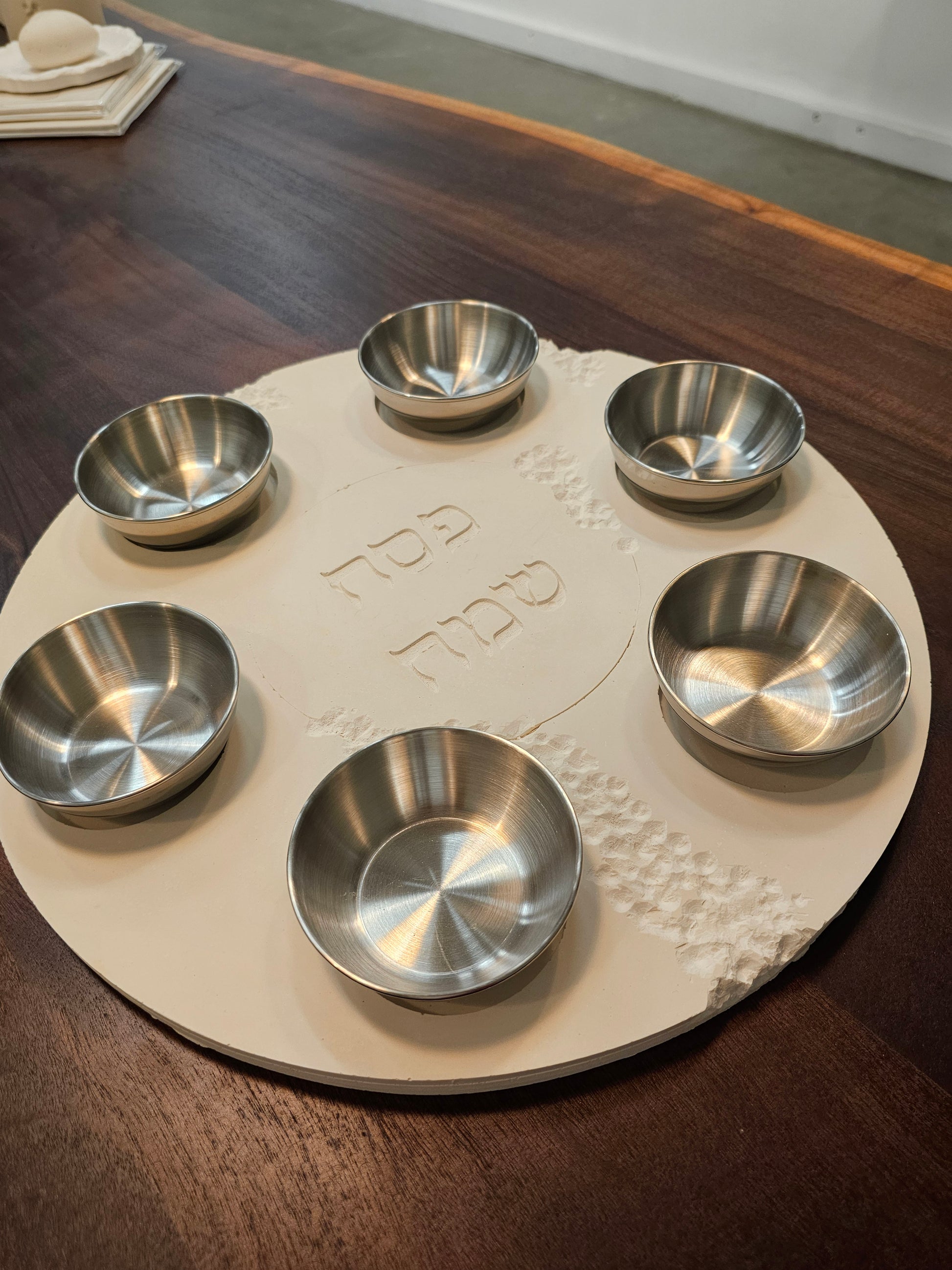 A modern interpretation of the traditional Passover Seder plate, designed to elevate your Pesach table with understated elegance.